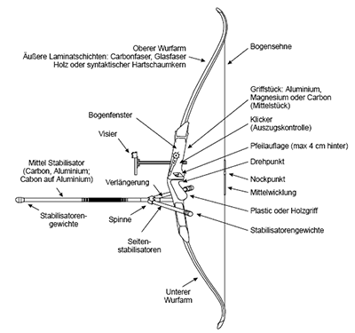Der olympische Bogen ist immer ein Recurvebogen, erkennbar daran, dass die Enden der Wurfarme nach vorne gebogen sind. Daran unterscheidet sich der Recurvebogen vom Langbogen und entwickelt daraus auch seine etwa 1/3 bessere Effizienz. Die neueren und modernen Materialien machen den Recurvebogen als „Olympischen Bogen“ zum idealen Einsteigerbogen. Mit dem Recurvebogen werden Pfeilgeschwindigkeiten zwischen 150 km/h und 240 km/h erreicht. Der Recurvebogen darf mehr technischer Ausrüstung als ein Blankbogen erhalten, hierzu gehören eine Visiereinrichtung, ein Kisser, ein Klicker und eine Stabilisation. |