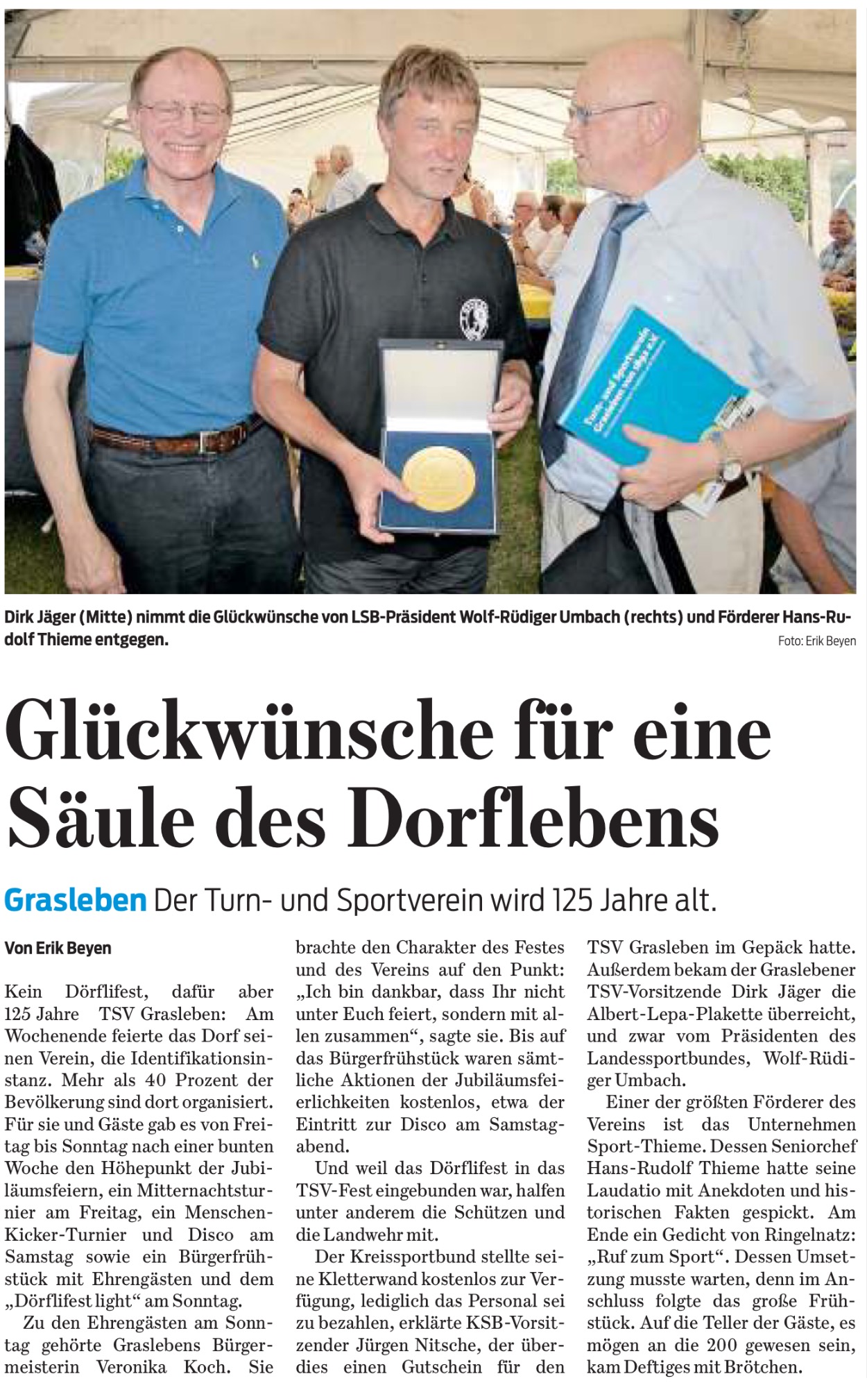 Ganz besonders bedanken wir uns bei den vielen fleißigen Helfern, die ihre Hilfe unentgeltlich eingebracht haben: Susanne Noerthen-Ulfikowski für Planung und Umsetzung, Jägermeister, die Krachlatten für Nadros Feuerwehr, Trautis Zelt, Stormis Stehtisch und die großartige Unterstützung allgemein, Christiane und Uwe Horn für das große Zelt, die Blumenstube mit Tina Schräder für das Blumengesteck, Christian Moritz für 50 Liter Freibier, Fa. Schliephake für die Tisch-Deko, der Kreissportbund für den Kletterturm, die Gemeinde Grasleben für die Hüpfeburg, die Schützen und Feuerwehr für Bierzeltgarnituren, die Landwehr für Bierzeltgarnituren und das zweite große Zelt, Kai-Elmar Ganselweit für die Moderation des Menschenkickerturniers, Klaus Weste für die Turnierleitung beim Mitternachtsturnier, verschiedene Abteilungen des TSV insbesondere Unihockey um Kalle Stempel, Fußball um Steffi, Elke und Kai Vogel sowie Sven Koch, Fitness um Ted Dörge sowie der Vorstand nebst Familien!