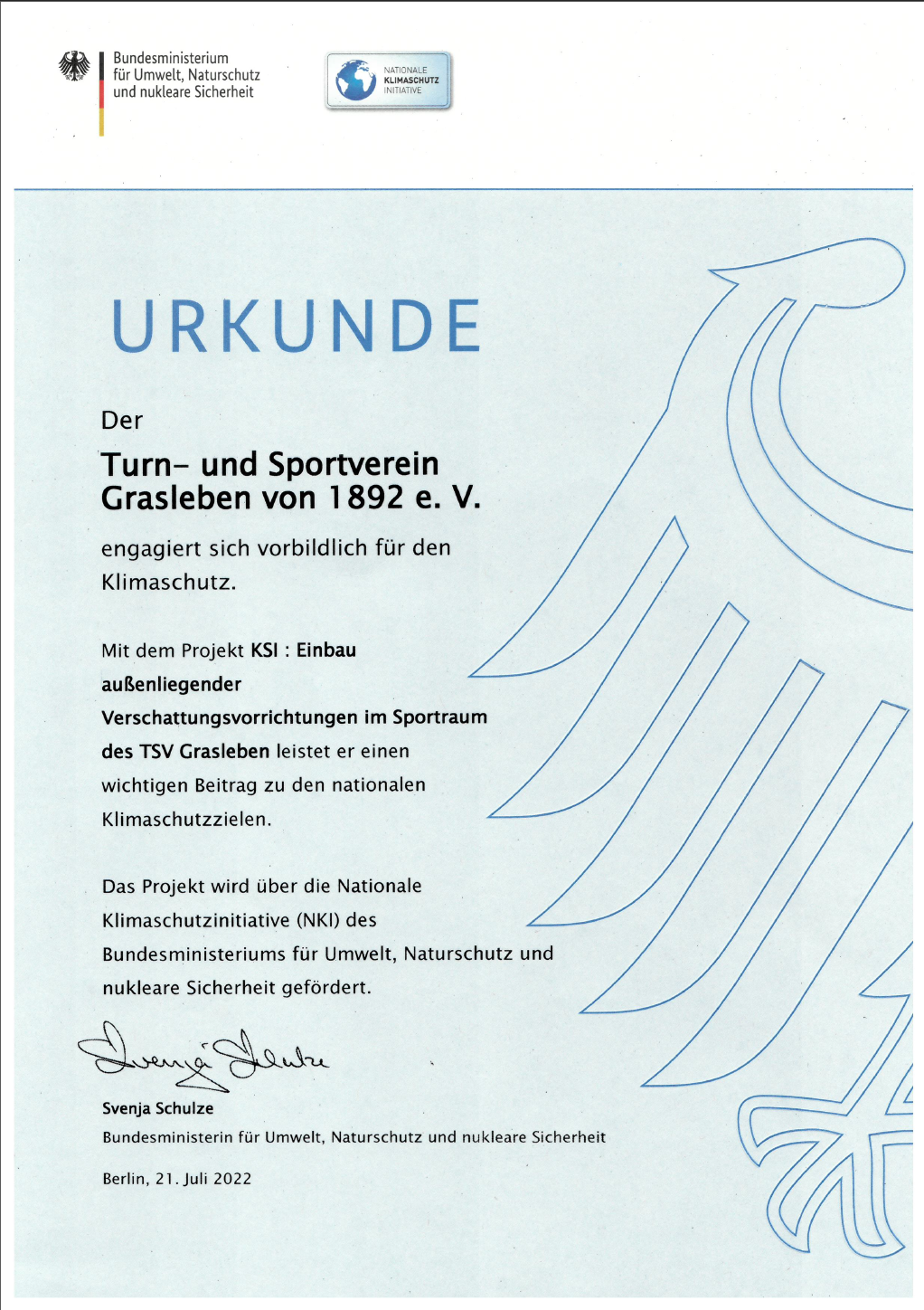 Der TSV wurde durch Frau Bundesministerin Svenia Schulze für sein vorbildliches Engagement für den Klimaschutz ausgezeichnet. Neben der Urkunde gibt es auch eine finanzielle Förderung. Durch diese Förderung kann die Gemeinde eigene Fördermittel einsparen und für andere wichtige Projekte verwenden.