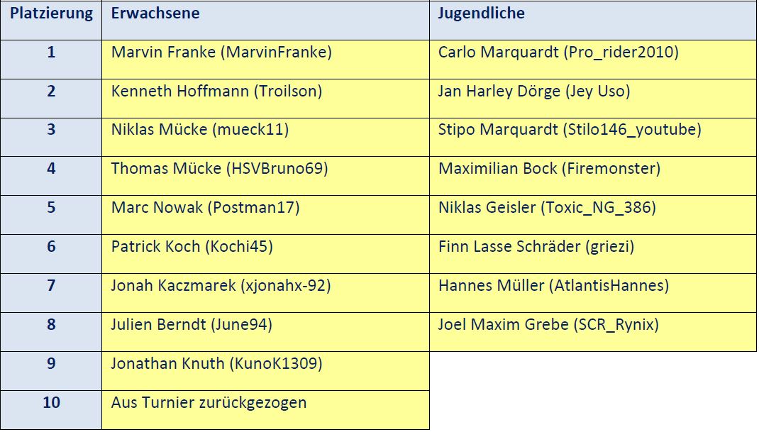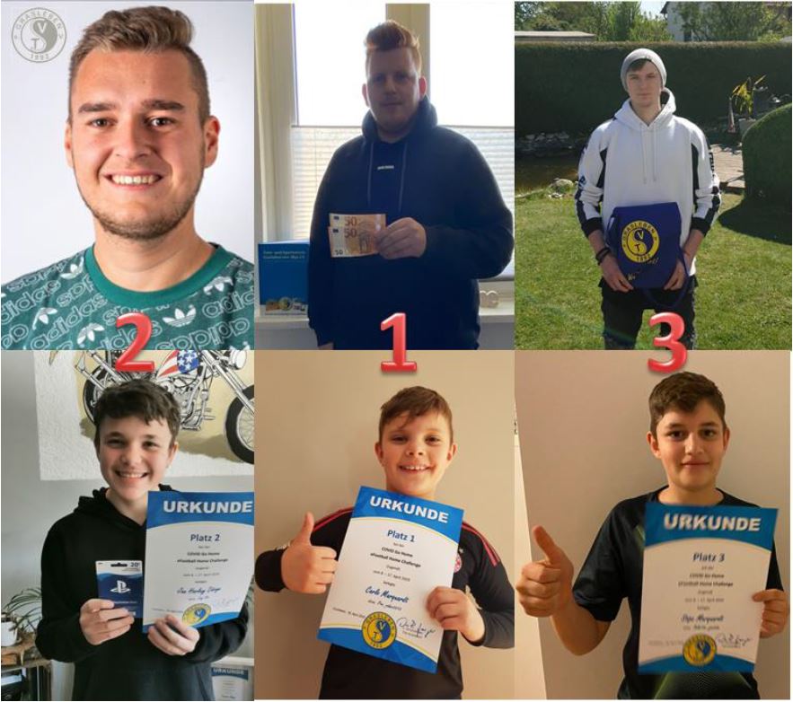 Die Runde der Jugendlichen bestand aus 8 Teilnehmern im Alter von 14 Jahren oder jünger. Es wurde in zwei Gruppen gespielt. Sehr spannend ging es in der Gruppe A zu, in der am Ende der Vorrunde die 3 Erstplatzierten jeweils 6 Punkte aufwiesen und so die Teilnahme an den beiden Halbfinalspielen durch das bessere Torverhältnis entschieden wurde. In der Gruppe B standen die beiden späteren Finalteilnehmer an den oberen beiden Plätzen. Nach den Halbfinals und den Spielen um die Plätze 5 bis 8 standen sich im „kleinen Finale“ Stipo Marquardt alias Stilo146_youtube und Maximilian Bock alias Firemonster gegenüber. Stipo behielt mit 5:2 Toren die Oberhand. Gewinner bei den Jugendlichen wurde der erst 9-jährige Carlo Marquardt alias Pro_rider2010. Im Endspiel konnte er sich gegen Jan Harley Dörge (Jay Uso) erst im zweiten Spiel durchsetzen. Nachdem das erste Spiel mit 2:2 unentschieden ausgegangen war, gelang der Siegt dann recht deutlich mit 8:2 Toren. Waren da etwa Nerven im Spiel? Die beiden Erstplatzierten bekamen als Preise Gutscheine für Playstation sowie, ebenso wie der Drittplatzierte, ein TSV-Badhandtuch. Alle jugendlichen Teilnehmer bekamen eine Urkunde und einen TSV-Rucksack. Alle hatten riesigen Spaß. Die eingerichtete WhatsApp-Gruppe war insbesondere zu den Zeiten der Vorbereitung der Spiele sehr stark frequentiert. „Auch wenn ich alle Spiele verloren hab hatte ich Spaß“, kommentierte ein Spieler nach der Vorrunde, worauf ein anderer antwortete: „Och habe auch alle verk{ackt} lul“